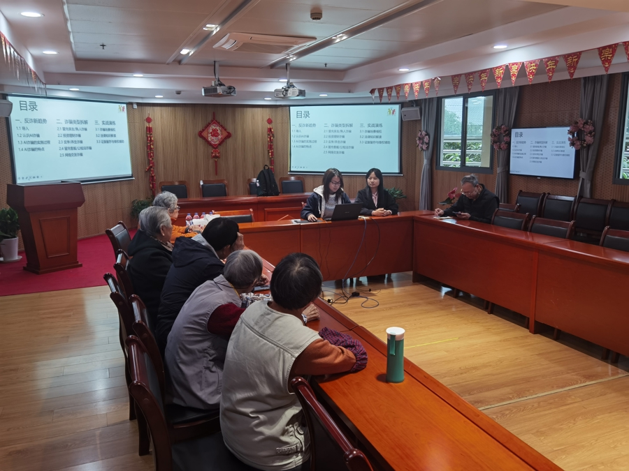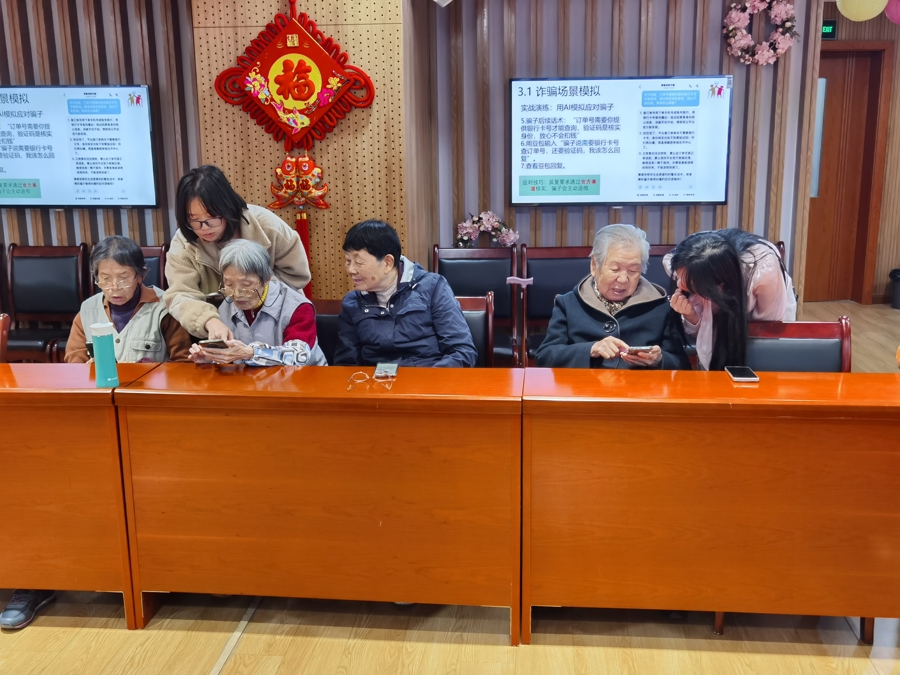 11月的课程涉及AI大模型应用。11月12日,寿惠芳和其他几位老人早早到了教室。这堂课内容是教老人用AI防诈骗。课上,助教张之之模拟了无法分辨是否遇到诈骗的场景,教老人可把问题抛给AI,让它帮着应对。