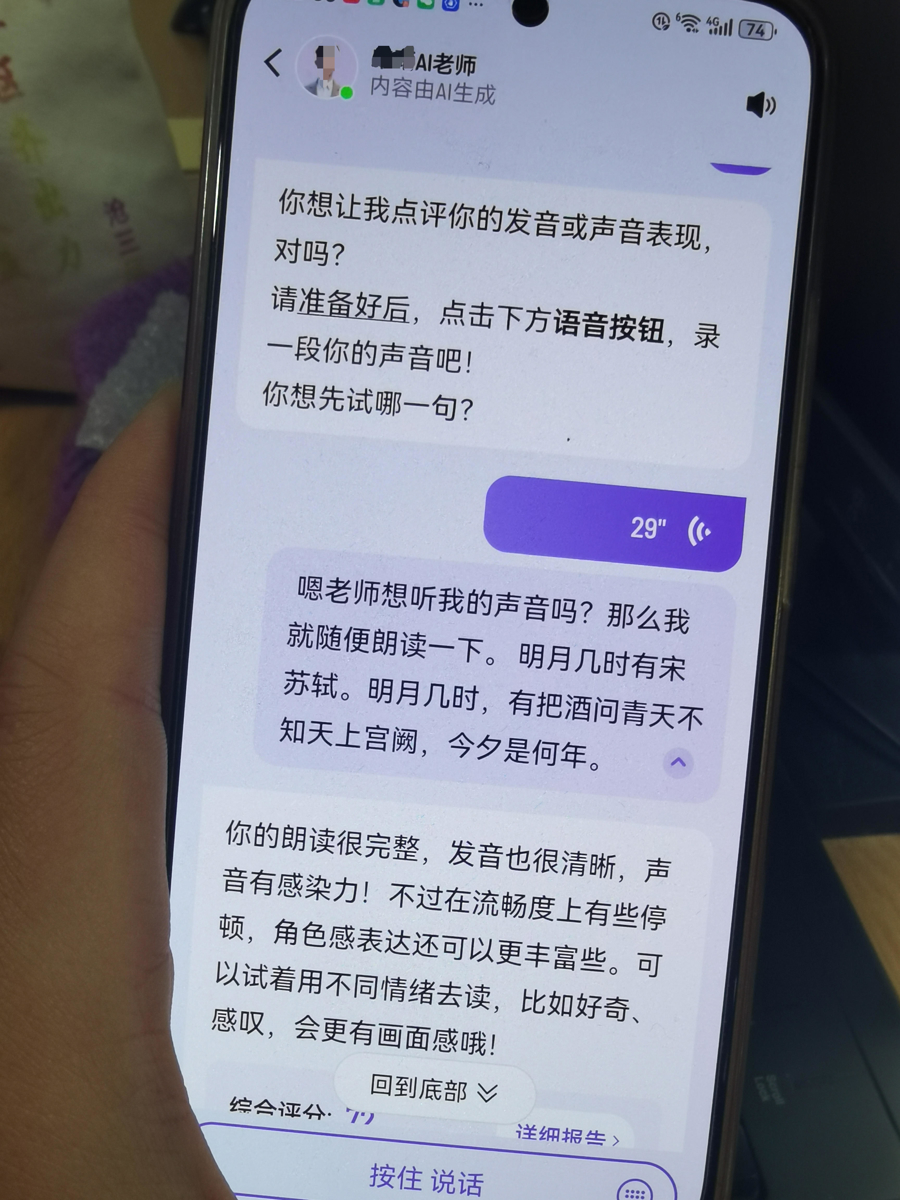 当过语文老师的她,尝试理解词中韵味。练声题里的两首宋词,一婉约一豪放,“寻觅”“梦回”放在一起恰似一个人的起起伏伏。再读“了却君王天下事……可怜白发生”,她降低了语速,在“怜”字后加了个停顿,“白”字加了重音。几秒后,AI弹出测评结果:三颗星。