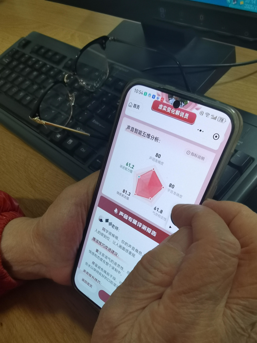 寿惠芳越发在意表达,与人讲话也咬文嚼字,如果没有念清楚字词的平翘舌音等,她会特意重说一遍。 吃饭时寿惠芳坚持“饭不语”,原因是戴着假牙吃饭,说话不利索。她的口味也变清淡了。过去的她偶尔嗜辣,现在她怕吃辣影响嗓音。 午饭后她不午睡,也不立即回到活动室,而是去冬天人不多的乒乓室站着练声,“AI提醒,练声一定要站着练,否则气息会提不上来。” 寿惠芳和AI老师对话。 寿惠芳和AI老师对话。 晚上,寿惠芳听完课也会练声,但房间里没条件读。她通常走到走廊尽头的电梯间——这里来往的人少,把镜子、手机和要朗读的文稿架在消防箱上,对着录制。一墙之隔的楼梯间更安静,她也试过,但AI测评提醒,这里会让录制的声音有回声,“出现混响”,影响效果。 寿惠芳觉得,软件几乎替代了真人老师,甚至比真人更有耐心。“没有觉得是机器人和我对话。太逼真了。AI太了不起了。”寿惠芳说。 最近,寿惠芳学习的课程加大了难度。寿惠芳不仅要学发音,还要学发出不同的音色。练习题是分角色朗读各类小说、童话。她喜欢读悬疑小说的段落,不喜欢言情小说里扭扭捏捏的对话。她的床头除了养生书以外,又多了一本新拆封的小说《法医秦明》。 这些练习是寿惠芳给自己加的。她在软件里看到一个公益项目:为缺少陪伴的自闭症孩子读绘本故事。当下,AI还没有办法完全像人一样带有感情地朗读绘本。绘本里角色很多,要用到老人音、男女青年音和正太音(12岁左右的男孩声音)。 读绘本时,她就到电梯间录音,先由AI带读,再根据理解朗读。不久之后,播音课老师告诉她,她读的两本绘本在100多份作业中脱颖而出,通过了审核。这意味着不久后就会有孩子听到寿惠芳朗读的故事。 AI给寿惠芳的声音开出专属报告。 AI测评中。 “公益活动是有报酬的。我读了两次,已经拿到了200元。钱事小,我也不靠这点钱养老。”寿惠芳更在意自己的价值,“我还是对社会有用的。” “前方到站” 在上海,越来越多的老人正在接触和使用AI。每周二、三下午,就在莘庄镇敬老院2公里之外上海闵行老年大学,也有给老人们开设的AI课程。 上海闵行老年大学校长焦金平说,其实上海老年大学、社区课堂、高校等组织机构早就为老人设计了AI课程。但让老年人学习抽象的AI原理、把AI当做生产工具并不现实。他们188比分直播是把AI嵌入智能手机课、摄影课等老人的需求中。比如有老人对娱乐、旅游等事物保有兴趣,就教他们AI修图、AI写游记、AI做攻略等功能,恰好契合他们的生活需求。“不求速成,但求润物无声,让技术真正服务于老年人的生活与尊严。”焦金平说。 上海闵行老年大学的手机摄影课程。 上海闵行老年大学的手机摄影课程,老人积极讨论。 在众多老人中,寿惠芳算得上特例。她用AI接近的是一个更具体、鲜活的梦想。 一次练习,是188比分直播空港和列车里的播报。寿惠芳想起了从前要播音时的状态:广播站机器是个大盒子,要拨“低压”“高压”两个按钮,调好音量后,敲两下话筒试音,听听窗外有没有“嘣嘣”的声音,然后拉近椅子,身体微微前倾。 现在的她还保留了这些小小的习惯,只是她不再敲两下话筒了。 听到按键后的蜂鸣音后,她对着手机里的麦克风,像个真正的广播员那样开口:“尊敬的旅客朋友,前方到站……” 接下来的练习是朗读一段美文。寿惠芳看了文字,起身走进旁边的乒乓球室,吸气,声音在空旷的房间中回响: “我们的爱好就是我们的方向, 我们的兴趣就是我们的资本, 我们的性情就是我们的命运。 个人有个人理想的乐园, 也有自己所乐于安享的花花世界。”